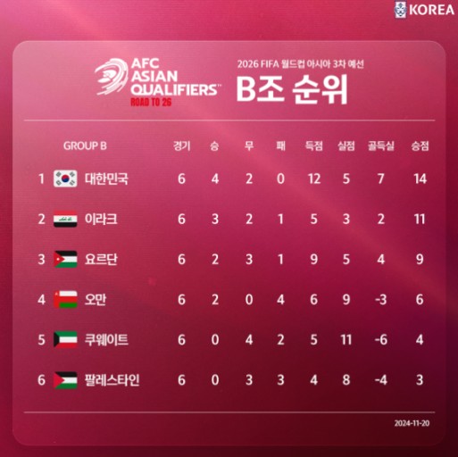먼저, 우리 축구대표팀의 현재 상황을 살펴보겠습니다. 현재 대한민국은 B조에서